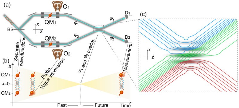 研究团队采用量子存储(quantum memory,简记为QM),结合相对论玻姆轨迹,对能量的非局域改变进行实验检验(图1)。QM产生的Stokes光子(记为S1)作为第一个粒子,而QM中存储的原子激发作为第二粒子。由于这两个粒子产生于同一个拉曼散射过程,它们之间刚好具有本研究所需要的量子关联。研究者可以对QM进行读取操作,以得到原子激发及其能量的位置信息,这属于强测量。也可以通过本研究设计的一种弱探测技术来获取位置信息。这里的弱探测可以类比为:在每个QM旁边,有一个视线受阻的观察者(用一只猴子表示)查看原子激发及其能量的位置。它的每次观察仅仅对QM产生一些轻微的扰动,同时会获得一些关于能量位置的模糊信息。这些位置信息虽然模糊却很有用,因为可以与后选择操作一起,验证过去发生的事件和未来发生的事件之间的量子关联。